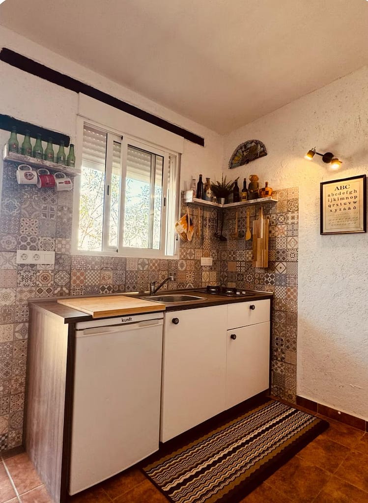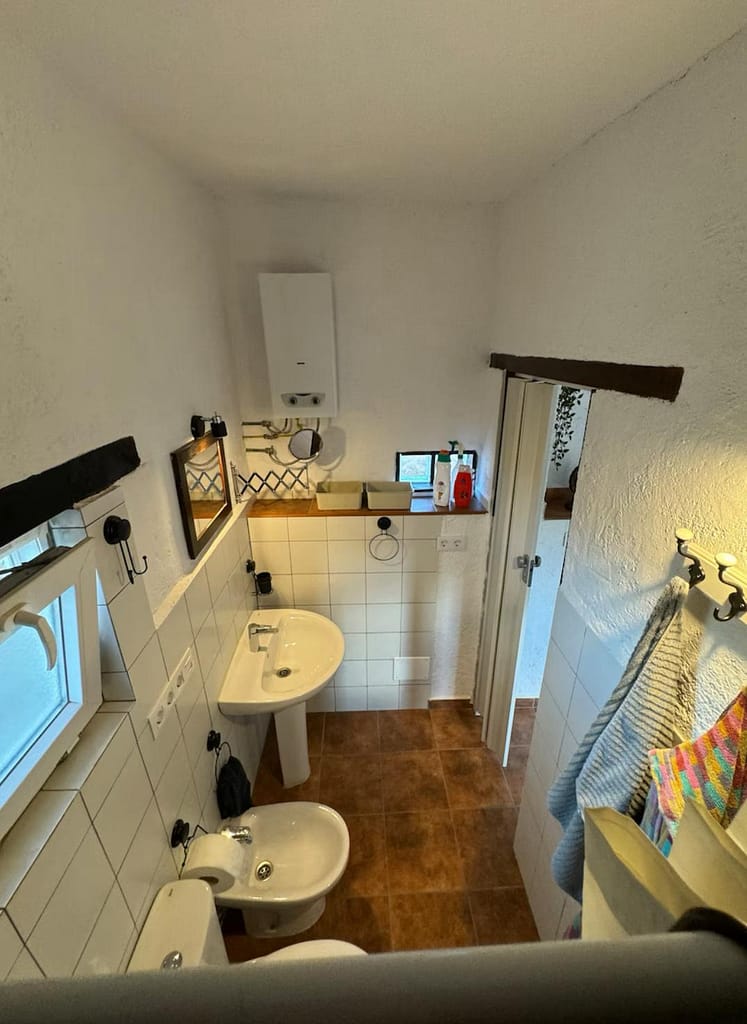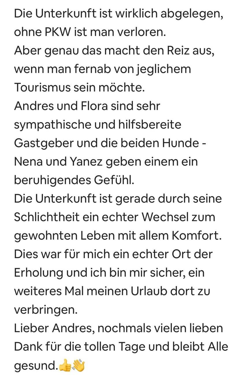 The house is rustic and simple but more spacious than our cabins — with a private walled garden, a basic kitchen, and enough room for longer stays. We, the owners, live in a separate house on the same rural plot, and our friendly dogs may welcome you at the entrance — though they do not enter your garden area.